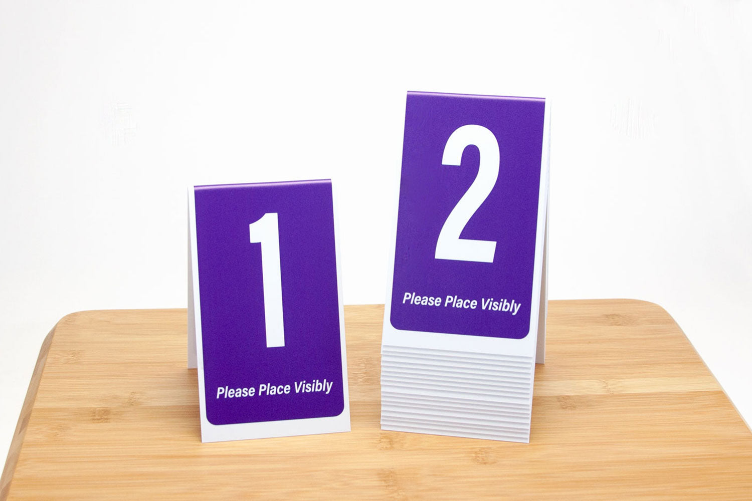 6" tall tent style table numbers are a popular number choice for food service establishments of all kinds such as restaurants, delis and breweries. Table numbers are printed with a bold white number on a purple background. "Please place visibly" is printed on the bottom of each number. Table numbers are printed on both sides. The tent styling of our table numbers allows for easy stacking when not in use.