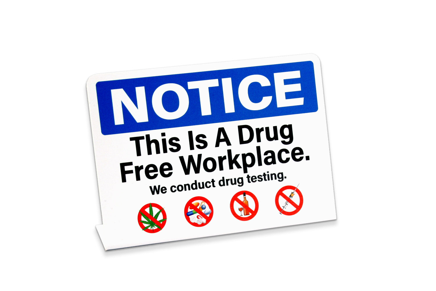 This is a drug free workplace signs provide an easy way to let employees and potential employees know that you are a drug free workplace and that you do conduct drug testing. Signs are printed in a clear, easy to read text. The L styling of these signs make them simple to display on any counter or table top.