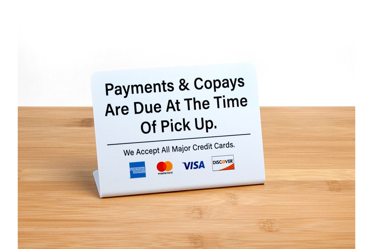 Payments and copays are due at time of pickup are perfect for any type of pharmacy, medical or dental office that dispenses product. These L style, plastic counter signs are printed in easy to read lettering and feature the icons of the four major credit card companies, AMEX, MasterCard, Visa & Discover for easy payment options of co-pays and bills. Payment and copays signs are easy to display on counters and desks.