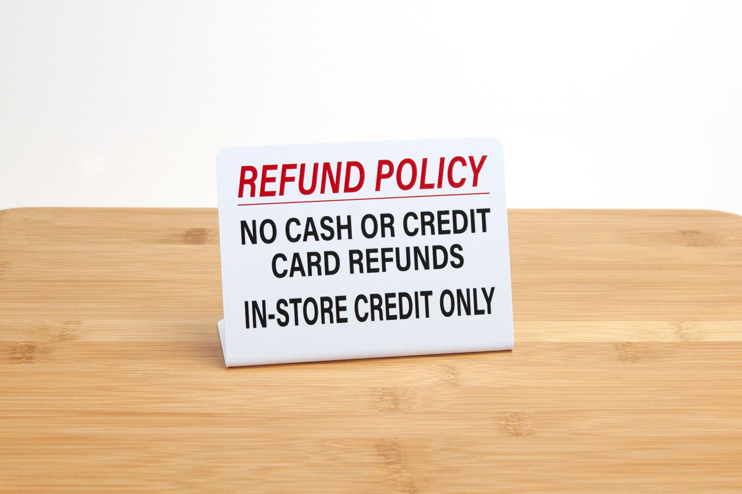Refund Policy Sign - In Store Credit Only are ideal for letting customers know your policy on returns. Signs clearly state that you only provide in-store credit, no cash or credit card refunds are provided. Signs are printed in an easy to read text. The L styling of these signs make them easy to display on counters.